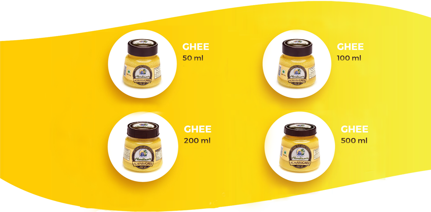 Nambisan's is one of the few producers of gheethat work on a standardization and are agmark label approved. Nambisan's Agmark Ghee is available in sizes of 50 ml, 100 ml, 200 ml, 500 ml, 1 litre, 5 litre and 15 litre tins.