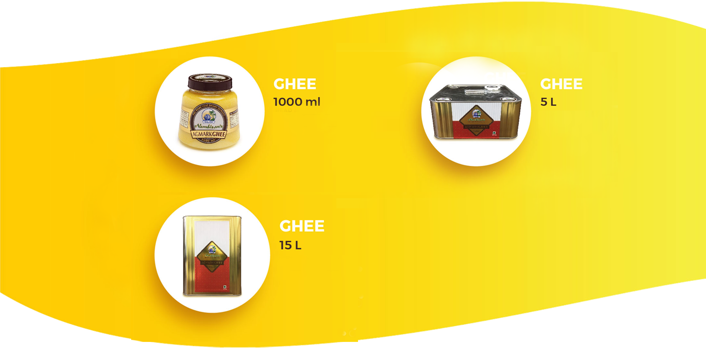 Nambisan's is one of the few producers of gheethat work on a standardization and are agmark label approved. Nambisan's Agmark Ghee is available in sizes of 50 ml, 100 ml, 200 ml, 500 ml, 1 litre, 5 litre and 15 litre tins.